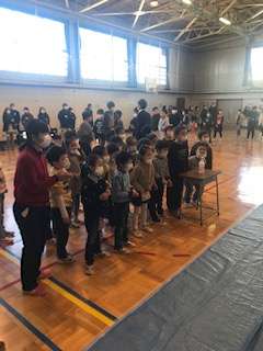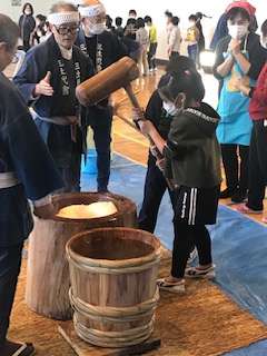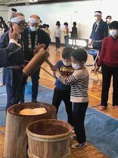 1年生は二人掛かりで、お餅つきをしました。クラスみんなで「よいしょー」の掛け声で応援していました。