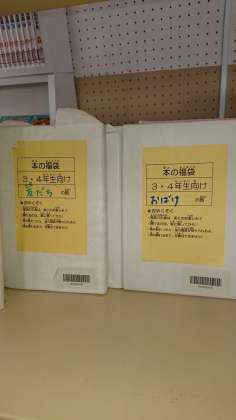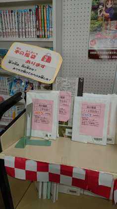 図書室の片隅のブックトラックに今、「本の福袋」が並んでいます。本が紙で包装され、中身がわからない……。図書委員会の皆さんが司書さんと準備してくれたそうです。こうやって並んでいると、ワクワクしますね。おかげで借りる人が増えているようです。