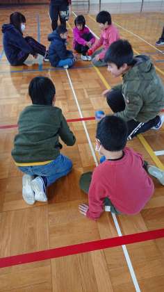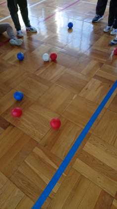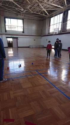 仲よし学級のみんなで、パラリンピックの競技でもあるボッチャをしました。投げ方を話し合い、赤と青の2チームでゲームをしました。白いジャッジボールにより近付けたチームの勝ちというルールです。最後までどちらが勝つか分からない。とても楽しめました。