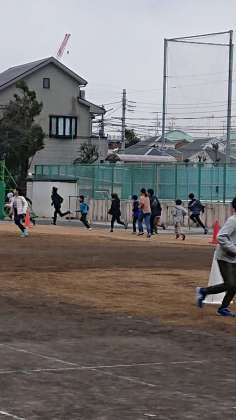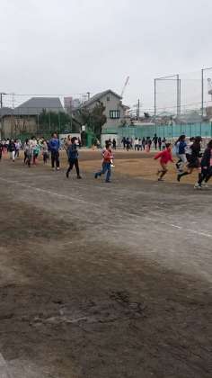 山スポ、今日は4,,6年生のランニング。内側がゆっくり、外側が速くと、分かれて走っています。先生たちも一緒に走っています。