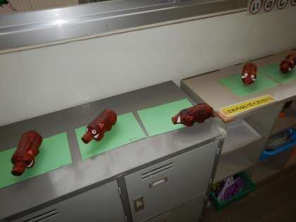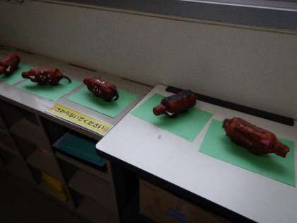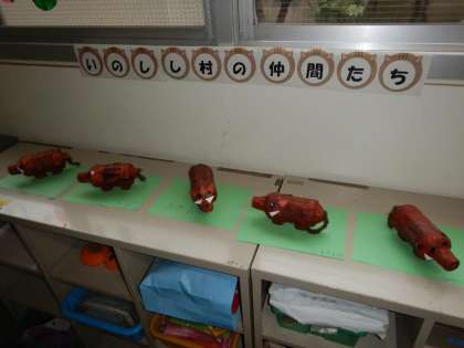 図工の学習で、イノシシの作品を作りました。ちぎってある紙を周りに貼りました。顔の作りも工夫して、個性のあるイノシシを作りました。