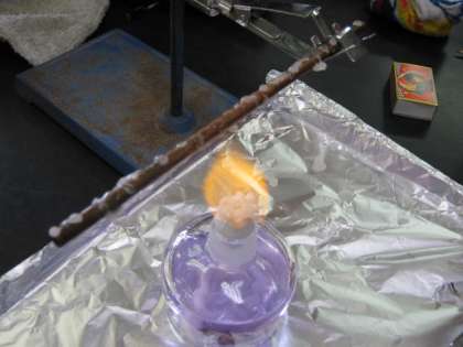 ロウを金属棒にたらし、炎を当てて溶ける様子を観察しました。
