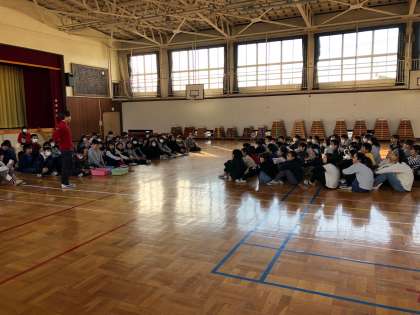 6年生の太鼓実行委員が司会進行をして、山崎小に続く太鼓の伝統を5年生につなぐためにたたき方を教えました。