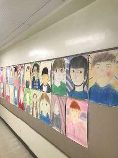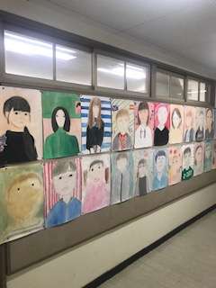 今、体育館に向かう二階連絡通路は、6年生の似顔絵ギャラリーになっています。「絵を見ただけで誰だかわかる」というハイレベルの絵がいっぱい。なかなか楽しい似顔絵ギャラリーです。みんなとっても上手。