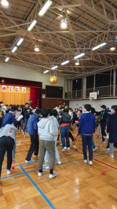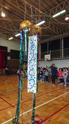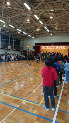 くす玉は、代表委員会、5年生が準備をしました。くす玉が割れたあとは全校合唱。「3月9日」を歌いました。