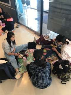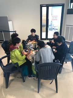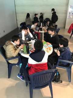 午前中のお楽しみが終わり、お昼ご飯。あと何のアトラクションを楽しむか相談しています。