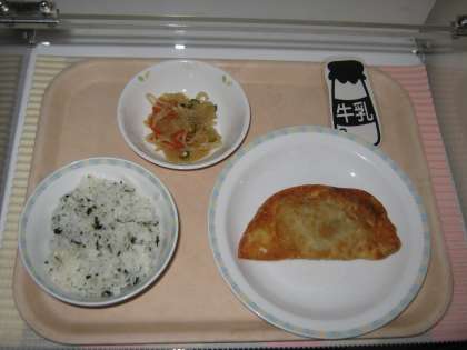 今日も6年生からのリクエスト献立です。第2位は2つで「ジャンボぎょうざ」と「こんにゃくサラダ」です。給食で食べるジャンボぎょうざは本当に大きいです。