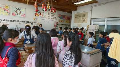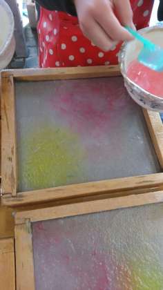 5・6時間目は、1組の体験です。 紙漉きをしてから、二色の色を使って模様を作ります。それぞれ、和紙に百人一首の句をイメージして作ります。でき上がった和紙に来週、句を書く予定です。みんな楽しみにしています。