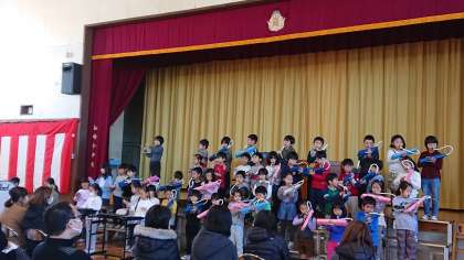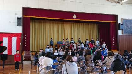 1年生は、来年度の入学式で、2年生として、「歓迎の言葉・歌・合奏」を披露します。その練習を3学期、ずっと頑張ってきました。今日は、お家の方にお披露目しました。張り切った1人1人の顔。さすが、もうすぐ2年生です。