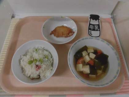今日から給食がはじまりました。みんなの進級をお祝いして「桜の花」をごはんにいれてみました。
