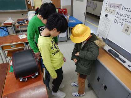 仲よし学級に新しい友達が増えました。高学年になった5年生が帰りの支度を手伝ってくれました。