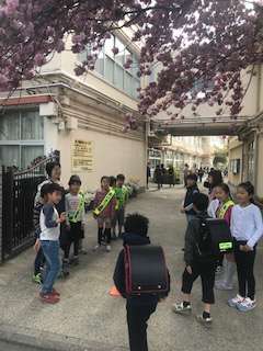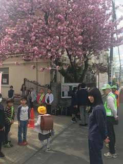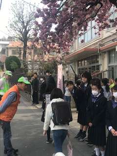 あいさつ当番の3年生と一緒にお出迎えです。中学校の先生と主に卒業生の生徒さんたちは小学生に優しく微笑んで挨拶してくれていました。