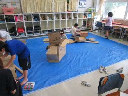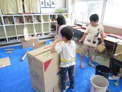 子どもたちからのリクエストでダンボール工作をしました。ガムテープやハサミを使い、熱心に組み立てていました。できたものを使って遊んでいました。