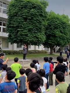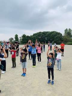 まずは、朝会。そして、ラジオ体操。その間に食事係さんは朝食の準備をしています。みんな元気です。