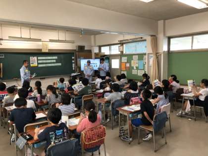 2組は、教室にてごみの話を聞きます。資料をみて、メモをとっています。