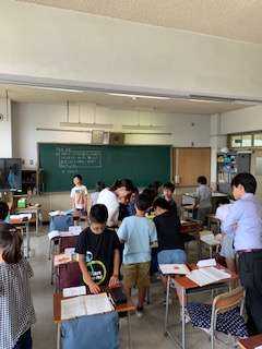 まずは、自分の考えをノートに書いて、次にお友達のノートをみてまわります。これも一つの対話的な学習です。お友達の意見を見て、自分の考えを深めます。