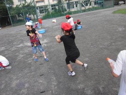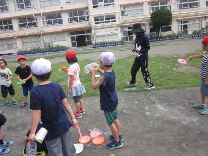 それぞれが持ってきた空き容器に水を入れて水鉄砲にしたり、シャボン玉で遊んだりしました。
