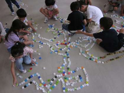 図工の学習で、小さく切った折り紙とペットボトルキャップを並べる造形遊びをしました。