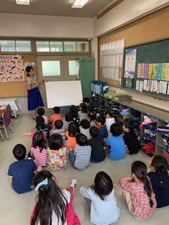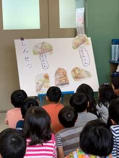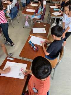 1ー1の道徳の授業風景です。先生のお話を聞いて、狼さんはどんな気持ちかな?と考えました。ワークシートのお友達の考えを読んで、なるほどと思った意見にシールを貼っています。お友達の考えの良いところをしっかり見つけていました。