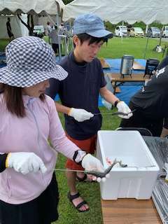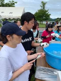 生きている鮎に串を刺して塩焼きの準備をしている山崎の引率です。