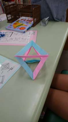 [むずかしいユニットおりがみをつくろう]を挑戦している子どもがいました。頑張って完成させました。