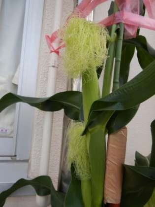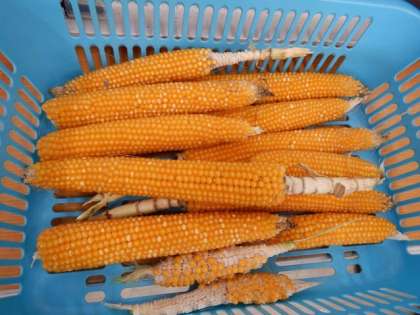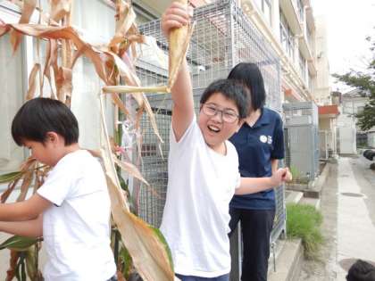 ポップコーン用のトウモロコシの収穫しました。ぎっしり詰まったコーンにみんな大喜びしていました。普通のトウモロコシに比べて硬いことなど、気付いたことを記録カードにまとめました。