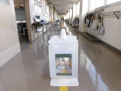 廊下に、コーンを立てて、みんなに呼びかけています。