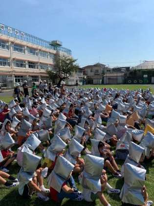 銀色の防災頭巾がずらりと並ぶと壮観です。災害はタイミングよく起こってはくれません。猛暑であっても身体を守る大切な防災頭巾。みんなしっかりかぶって避難訓練を頑張りました。