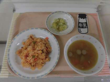 今日は、オリンピック・パラリンピックを応援する献立です。ブラジルでは豆を煮込んだ料理が食べられます。給食では、ひよこ豆や大正金時豆を煮込んだスープを食べます。また、チキンライスではブラジル国旗の色から「緑色」をグリーンピース、「黄色」をコーンで表しています。