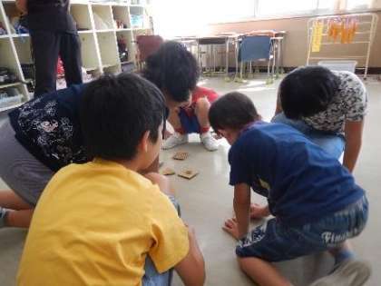 リサイクル工作で、駒作りをしました。四角と三角のダンボールの真ん中にアメリカやハワイでよく売られているガラス玉をつけました。色を塗った後、友達と楽しみながら何度も回していました。