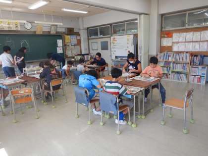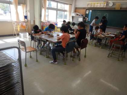 生活単元学習の時間にアイロンビーズの額縁作りをしました。額縁の材料は…なんと…納豆のフタです。子どもたちは、納豆のフタが額縁になることにびっくりしていました。フタの回りにビーズなどで飾りをつけ、最後に以前作ったアイロンビーズを中につけて完成させました。
