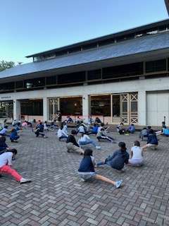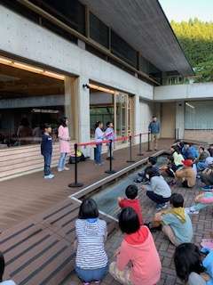 さあ、最終日の朝です。みんな元気に朝の会。今日はふじやまビレジをあとにして村めぐりです。今日も素晴らしいお天気。