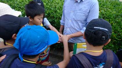 4年1組の緑の出前授業です。緑道を歩いていると、幼虫を見つけました。オオスカシバの幼虫です。