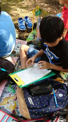 虫を観察しながら、しっかり記録をしています。