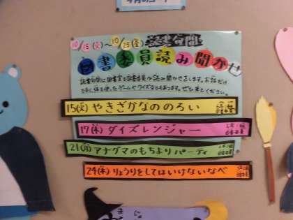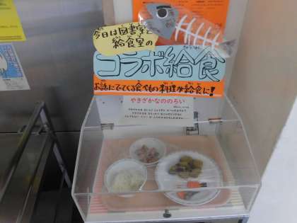 「やきざかな の のろい」は、実は、図書室と給食室のコラボから生まれた給食です。「やきざかな の のろい」という絵本があるのです。今月は、さらに、いくつかのコラボがあります。どうぞ、お楽しみに!