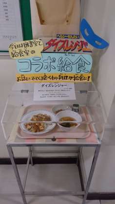 今日の給食は、大豆だらけです。甜麺醤、豆腐、味噌、醤油、大豆に油揚げの6種類が入っています。みんなの平和と健康を守るんじゃーとダイズレンジャーも言っています。おいしく食べれますね。