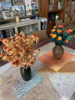 手前のドライフラワーは、昨年、舟形から送って頂いた紅花をドライフラワーにしたものです。