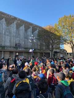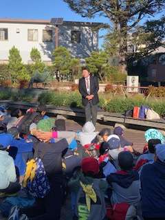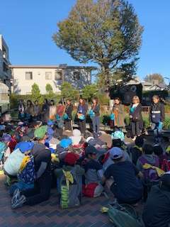 晴天に恵まれて、舟形交流2日目東京ツアーにお出かけします。付き添いの保護者の皆さんとご挨拶して、舟形小の校長先生にお話いただいて、さあ、出発です。