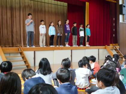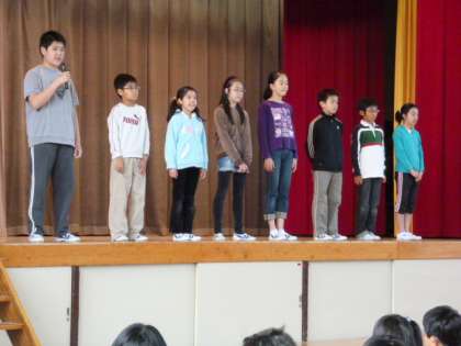 前期の各委員会委員長のみなさんが、自己紹介をしました。その中で、活動の内容やお知らせ、全校へのお願いを発表しました。運営・代表委員会、運動委員会、保健委員会、飼育委員会、集会委員会、図書委員会、放送委員会、音楽委員会の8つの委員会に5年生と6年生(代表委員会には4年生も参加)が分担して所属し、自分たちの手で学校生活をよりよいものにするため力を合わせて頑張ります。