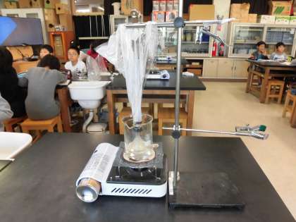 水を温め、沸騰させ、そのあわを集める実験をしていました。
