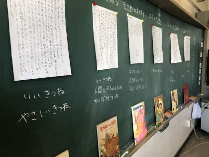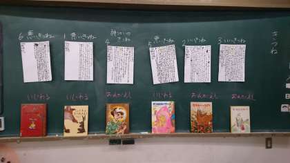 1組も2組も6冊の本から、あらすじをまとめ、発表を行いました。共通点は、きつねです。やさしいきつね、わるいきつね、恩返し、いじわるなどいろいろな意見がでました。