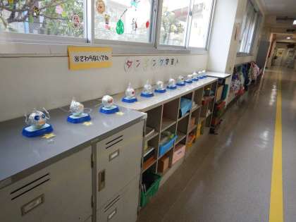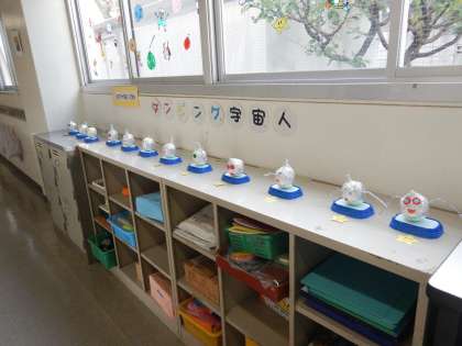 図工の時間に様々な材料を使い、作品を作りました。材料は、カプセル・アルミホイル・モール・シール・粘土(使わなくなったもの)です。台は画用紙・ヨーグルトのフタです。まさか、こんな可愛い作品になるとは、大人も子どももわかりませんでした。すごいです!