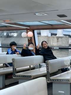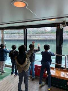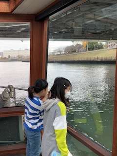 隅田川をのぼっています。貸し切り状態なので船の中を自由に楽しんでいます。スカイツリーが見えてきました。