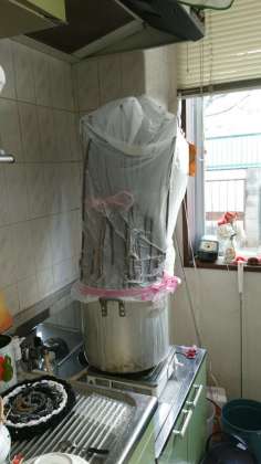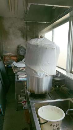 11時頃から三時間ぐらい、切った楮を蒸します。美味しそうなさつまいもの匂いがしました。