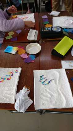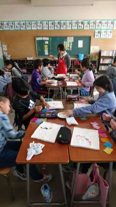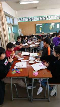 4年1組は、以前作ったパルプに色とりどりの和紙をちぎって飾りつけをしています。