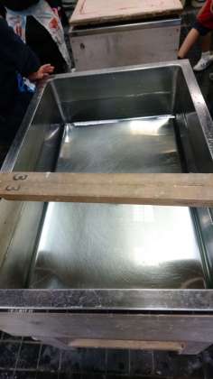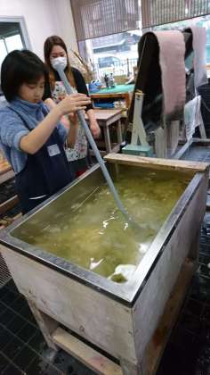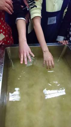 水に山崎産和紙を入れて拡販します。そこに、手を入れると和紙はくっつくかつかないか予想をしました。それぞれの意見が出たため、二人でやってみると、手にはつきませんでした。