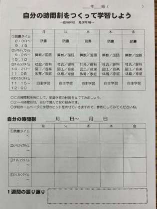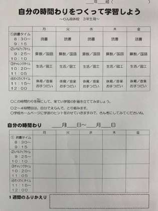 学びの習慣を大切に出来るように、時間割表の例を各学年用に作って郵送しました。コピーするなどして、ご活用ください。