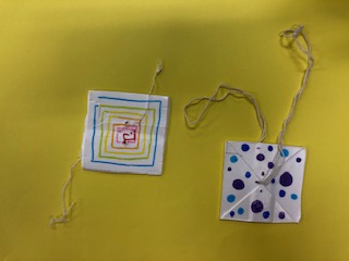 紙パックの底の部分を2枚張り合わせたり、穴を開ける位置を変えたりして、よく回るブンブンごまをつくってみましょう。ひもの種類や長さを変えて工夫をしてみるのもよいですね。