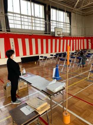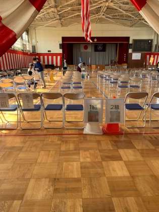 体育館に入って左側が1組、右側が2組の配布場所になります。