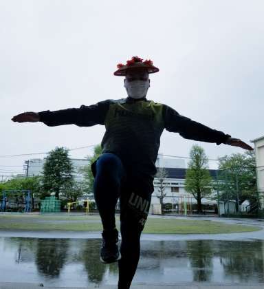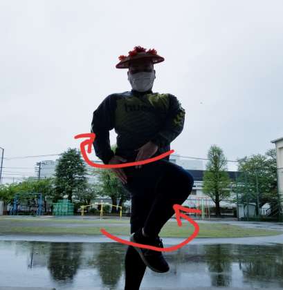 片足立ちで、上半身をひねり、両手で反対側の股関節の外側を同時にタッチします。